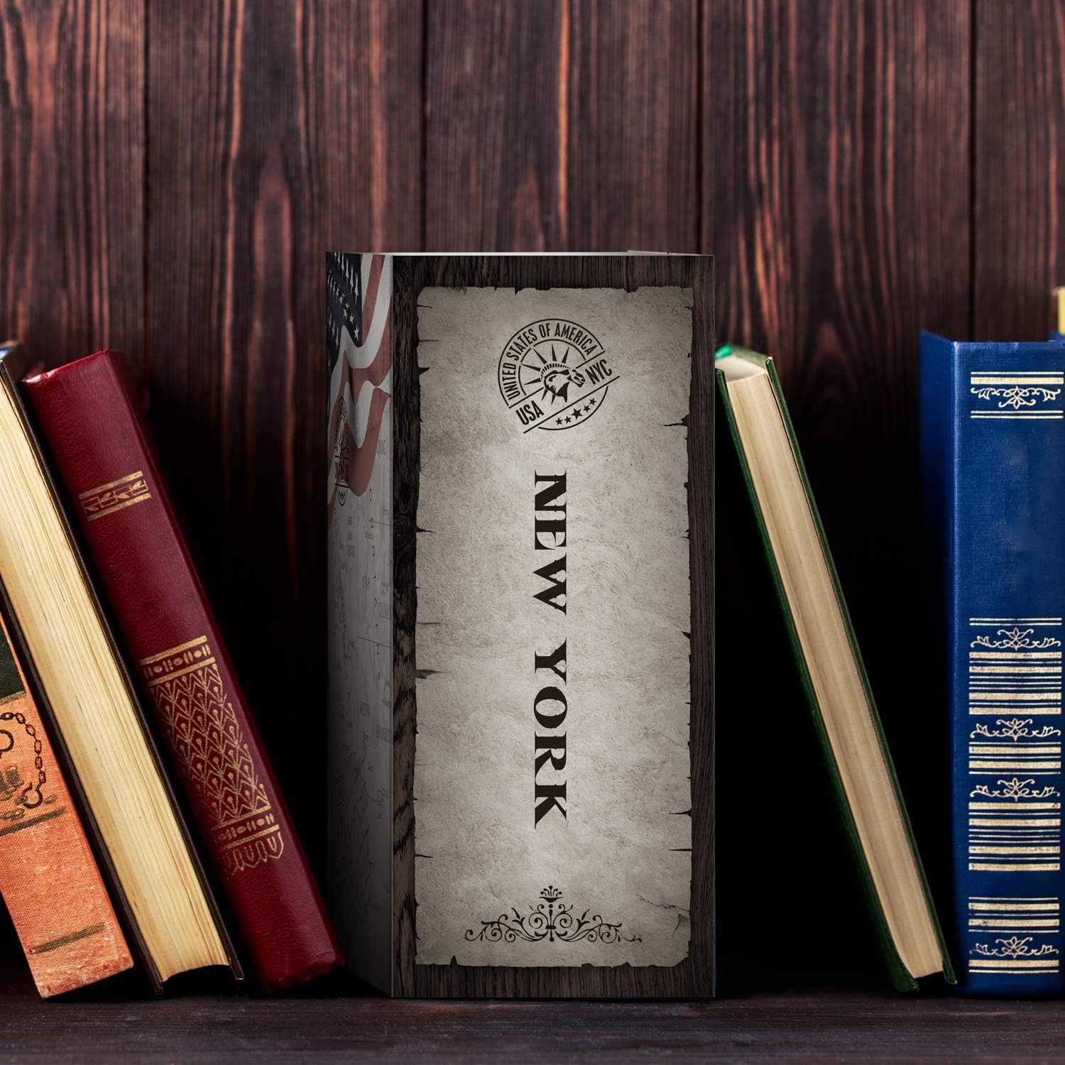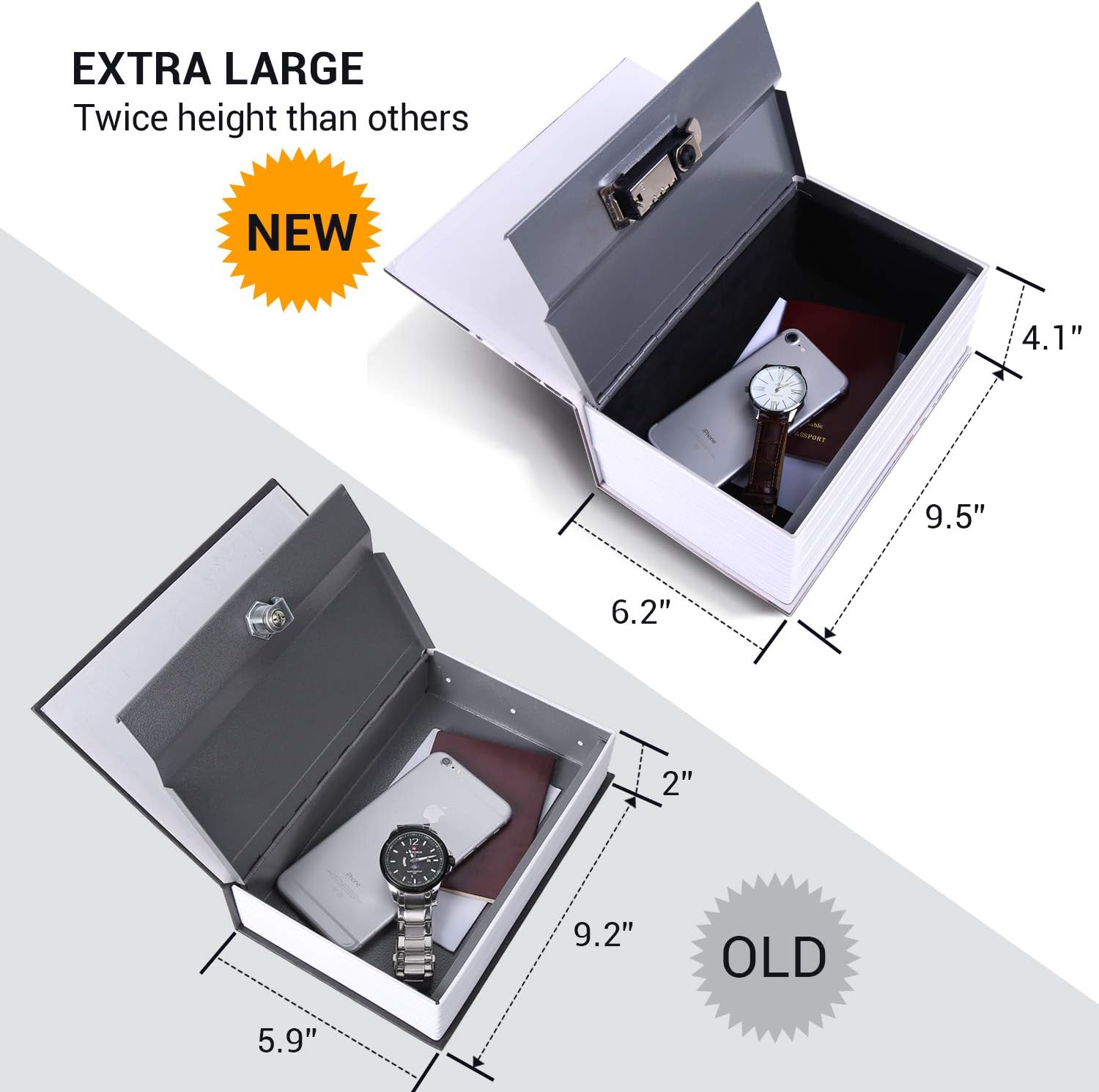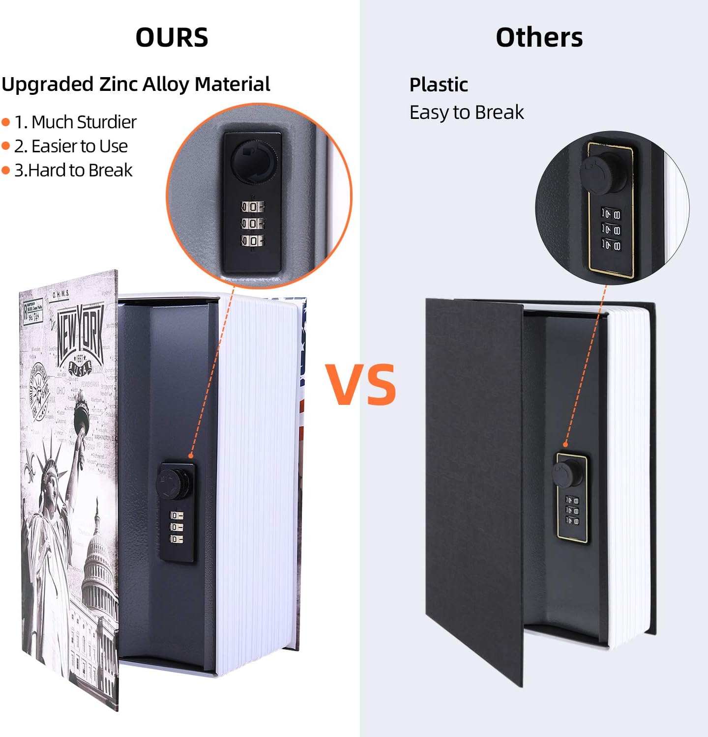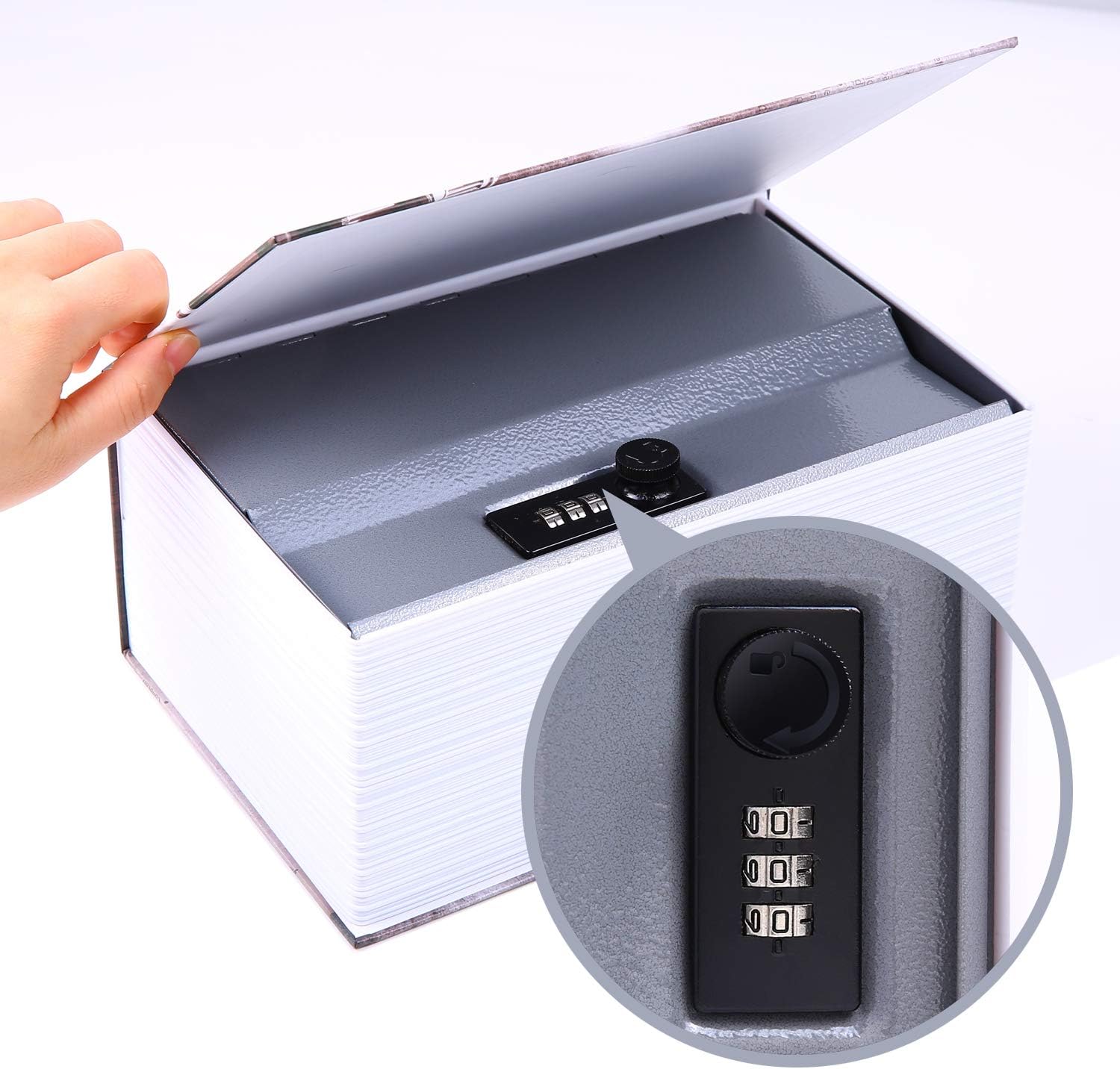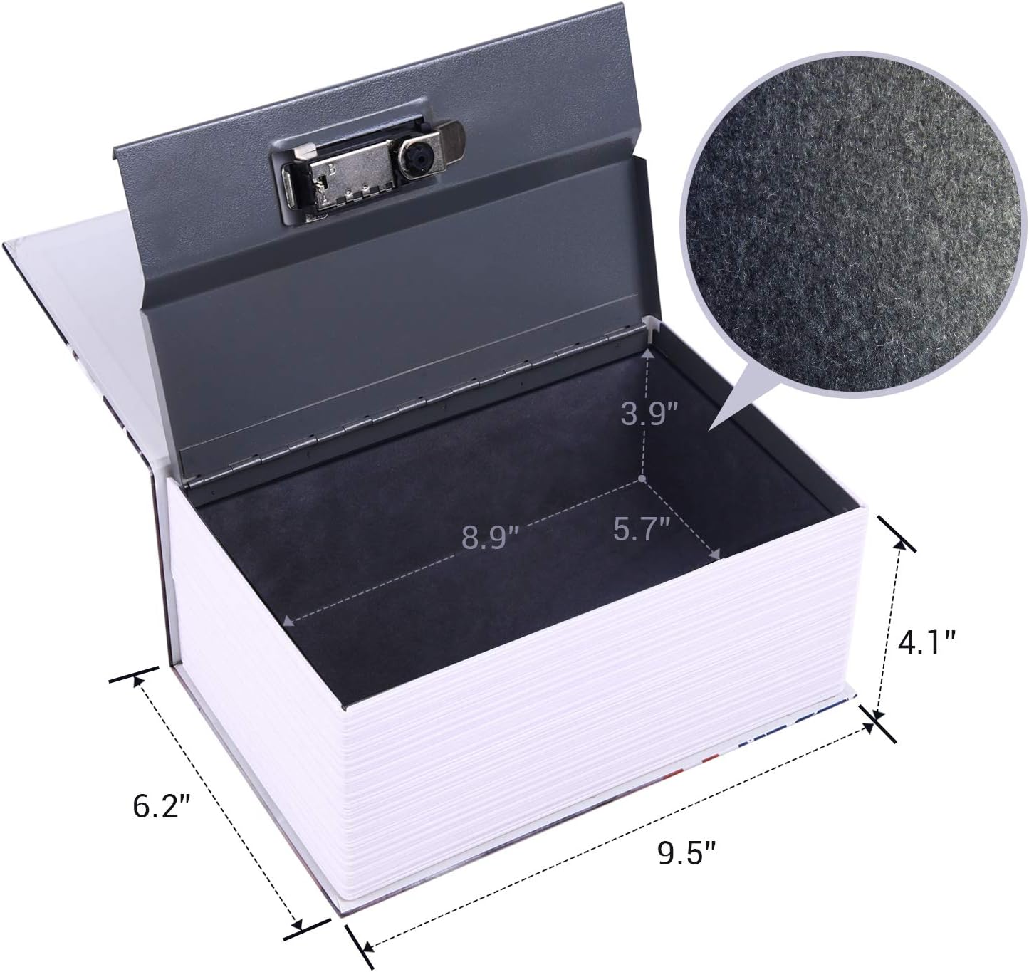 The simulated book pages and hard back book Cover make the product look like a real book The inner thicken steel plate and the flock printed Interior makes the product soft to touch without hurting your hands and last for years on end The marginal gap allows you to insert coins, cards, or cash conveniently without opening the book safe, but it’s hard to drop it out even you shake the box.