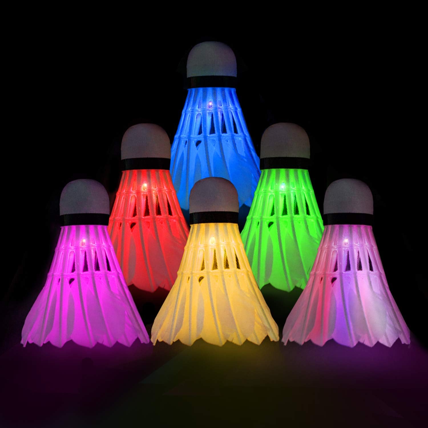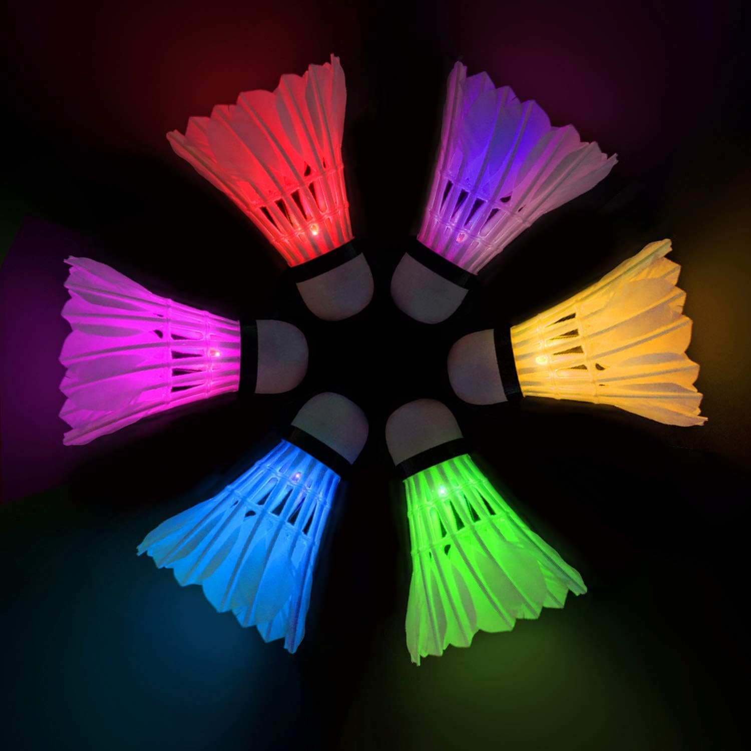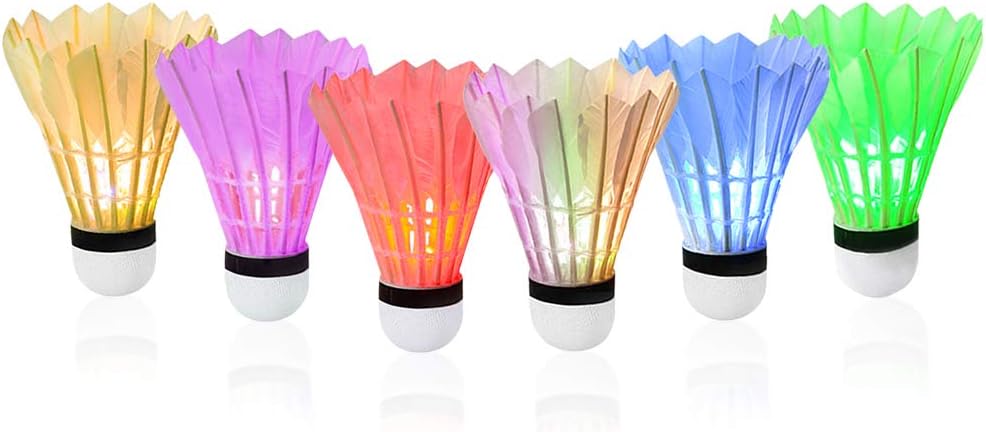Goose Feathers This LED badminton shuttlecocks are built with goose feathers and a cork ball head, which are built to last;The LED badminton birdies are as sturdy as the usual birdies. LED Badminton Shuttlecocks Equipped with high quality LEDs, the feather Badminton shuttlecocks turn red, green, blue, yellow, purple and one colorful flashing. The LED lights can be switched on and off easily with the press of a button placed in the back of the cork. A fun option for both amateurs and beginners alike during the day, and especially in the night. Each shuttlecock weighs only 6.7g/0.24oz for great bounce and ease of handling.